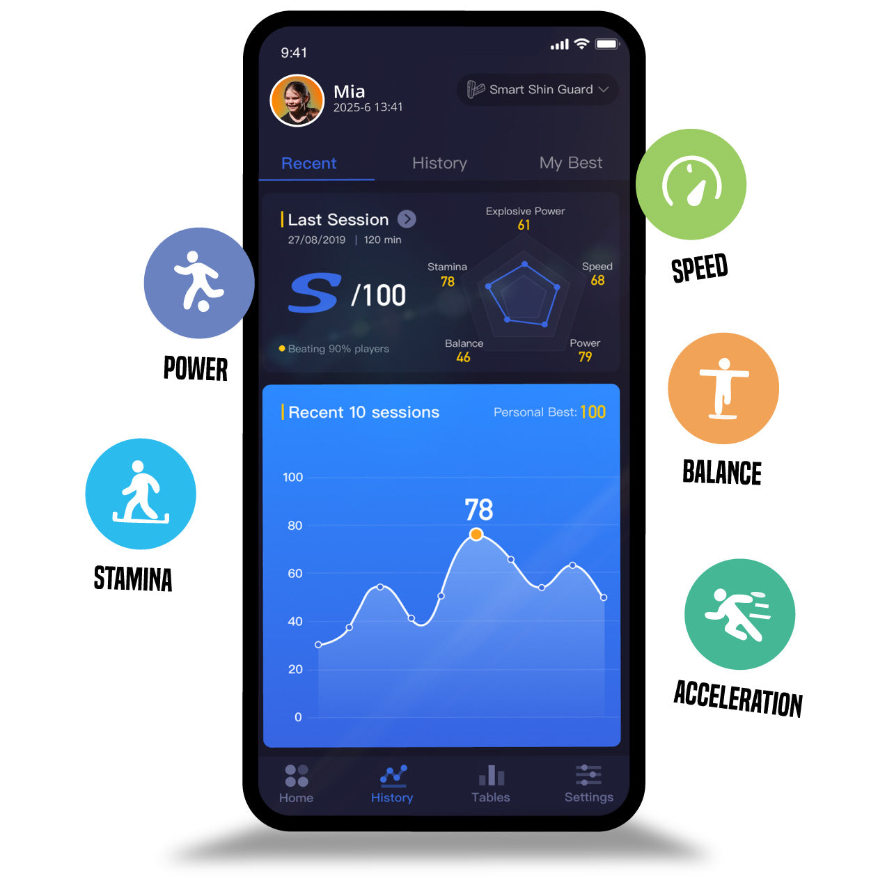 • TRACK PERFORMANCE – Slip the shin guards into your sock and measure over 100 data points per second while you play. Then download your data to a smart phone and receive easy to understand data about speed, acceleration, stamina, power and balance.